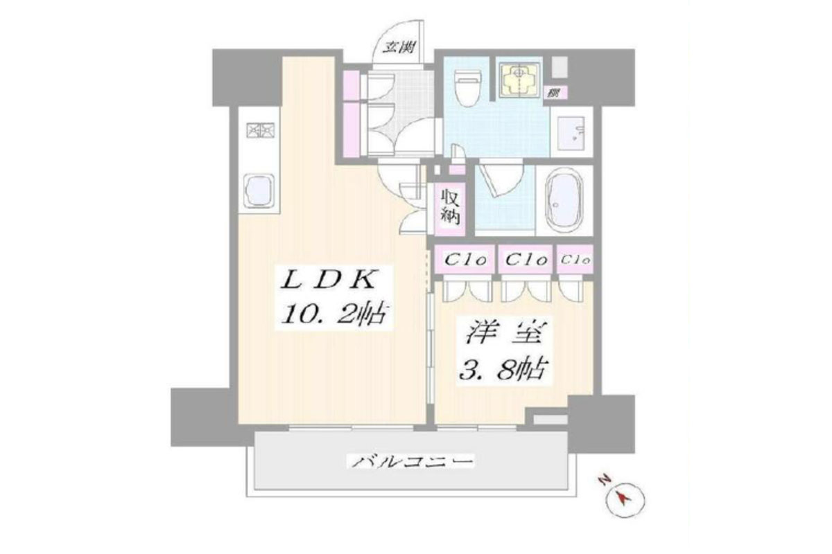 室内は34.53㎡の1LDK。10.2帖のリビングと3.8帖の洋室と、ひとり暮らしならゆったりと暮らせる間取り。