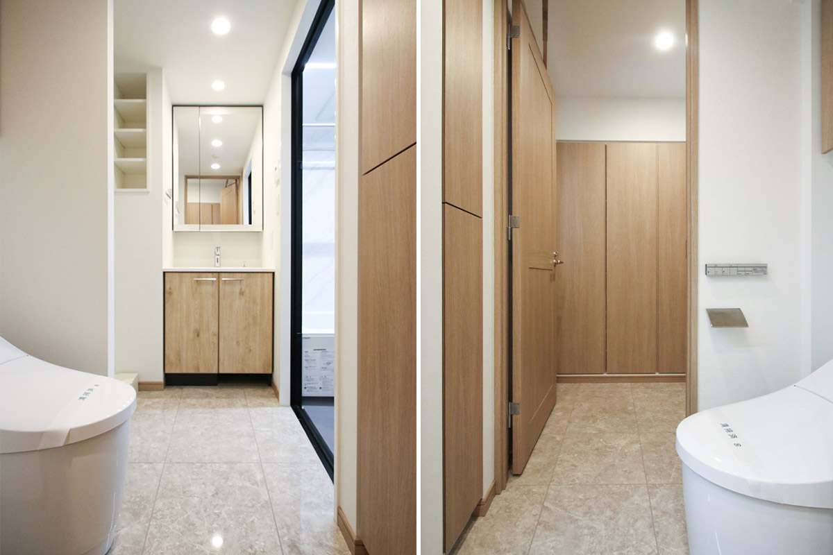 サニタリースペースは、玄関から続く大理石床が高級感あふれるホテルライクな仕様。