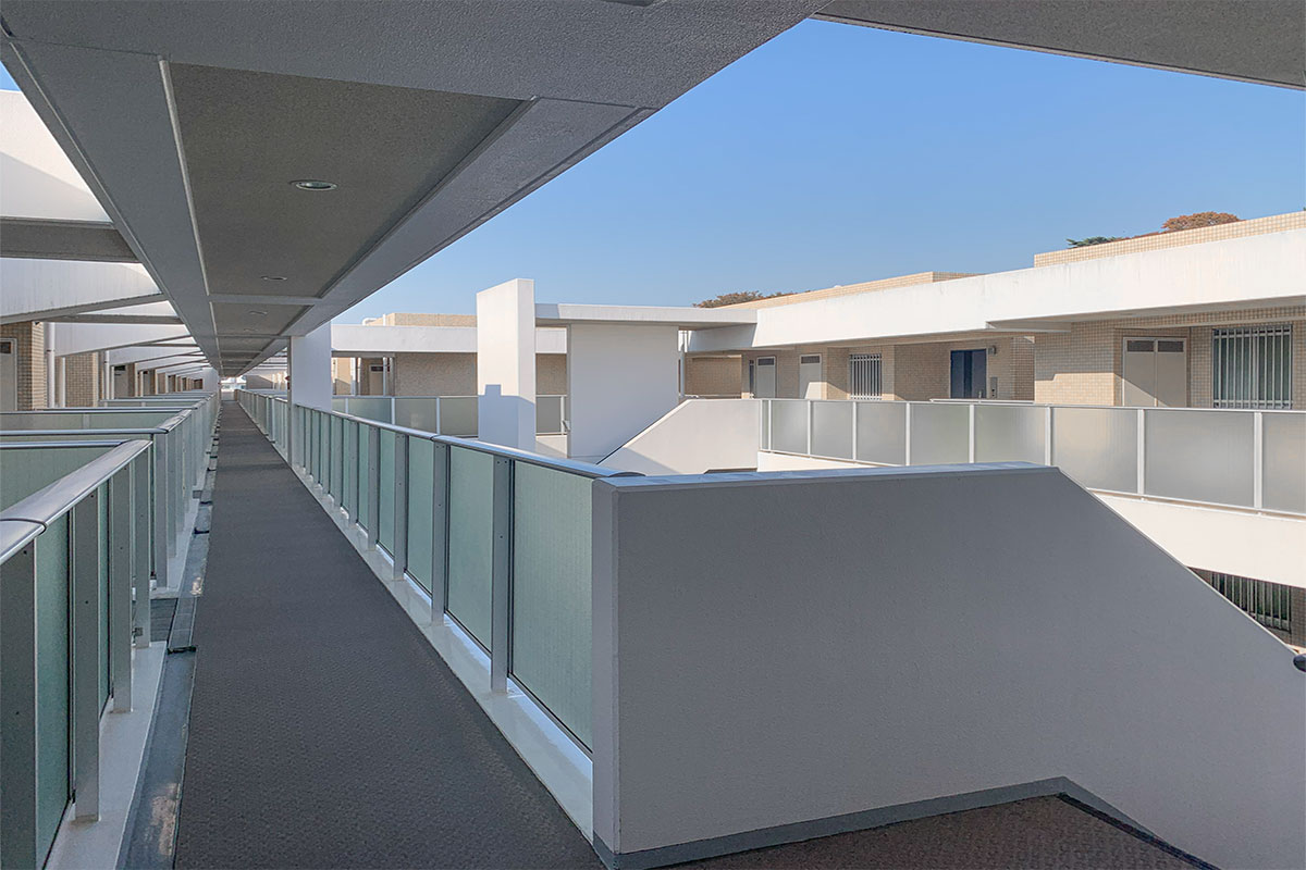 抜けのよい青空を垣間見ながら、共用廊下を通ってお部屋まで向かいます。