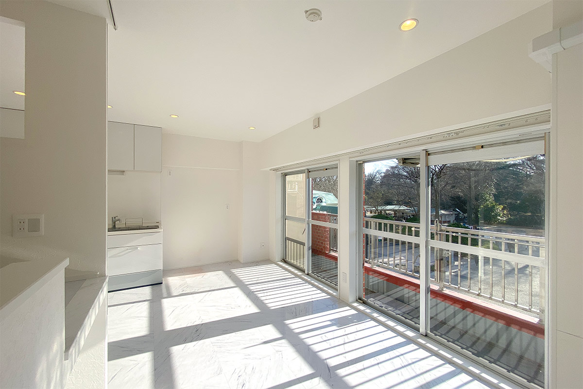 昼下がりには新宿御苑の後方から光が差し込み、室内の照明を消していても明るさが確保出来ました。