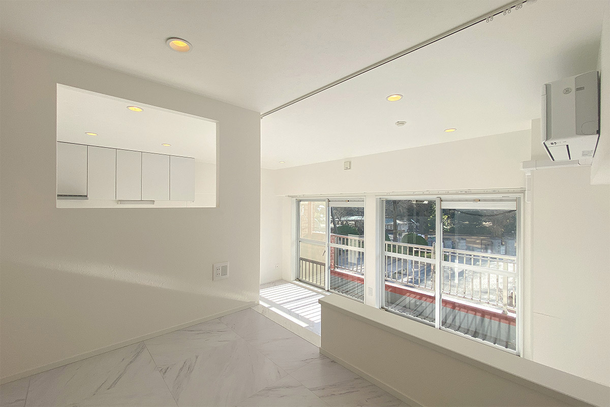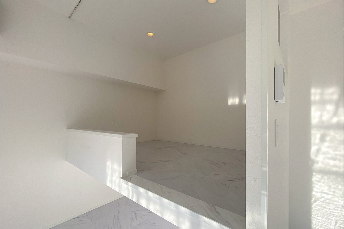 すっきりと白で統一され、大理石調のフロアタイルが高級感も感じさせる室内。