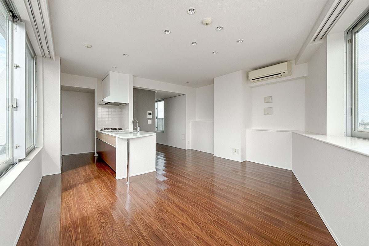 上階は13.3帖のLDK、横幅いっぱいの窓と南西2面採光で開放感たっぷり!