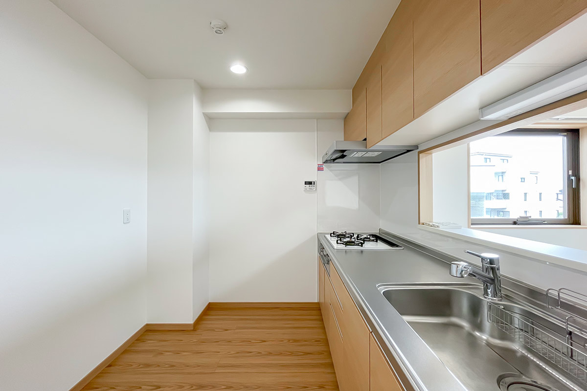 キッチンも広々。カウンターキッチンで、3口ガスコンロ、グリル付き!背面スペースにも余裕があるので、冷蔵庫+レンジ・炊飯器などの家電ラックもしくは食器棚も置くことができます。