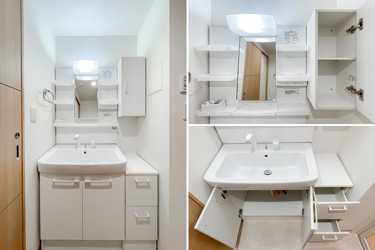 水回りも洗面脱衣所とお手洗いはしっかり別れており、洗面脱衣所には扉付きの収納スペースがありました。
