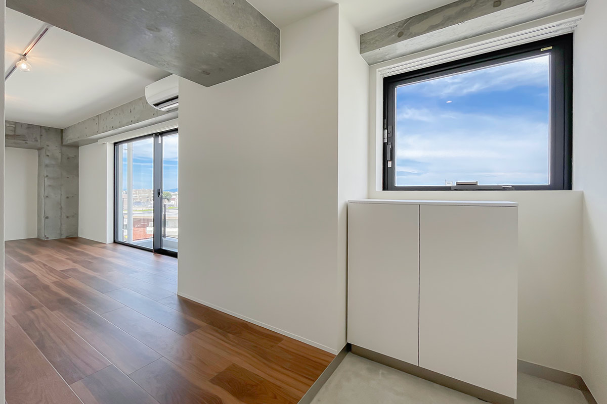 残念ながら南側はお隣のマンションなのですが、この形のおかげで西側に抜けを感じられます。
