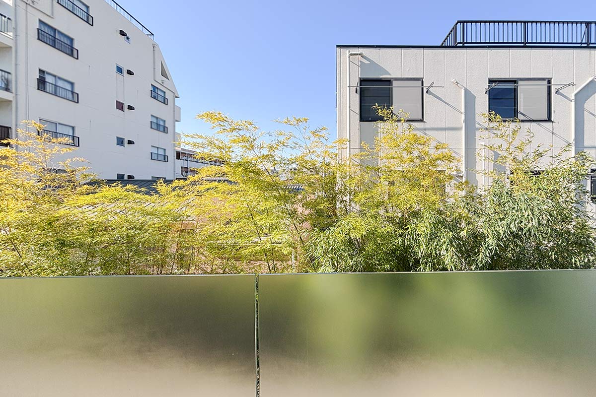 窓の外には植栽の竹林が揺れ、青空とともに目にも鮮やか。