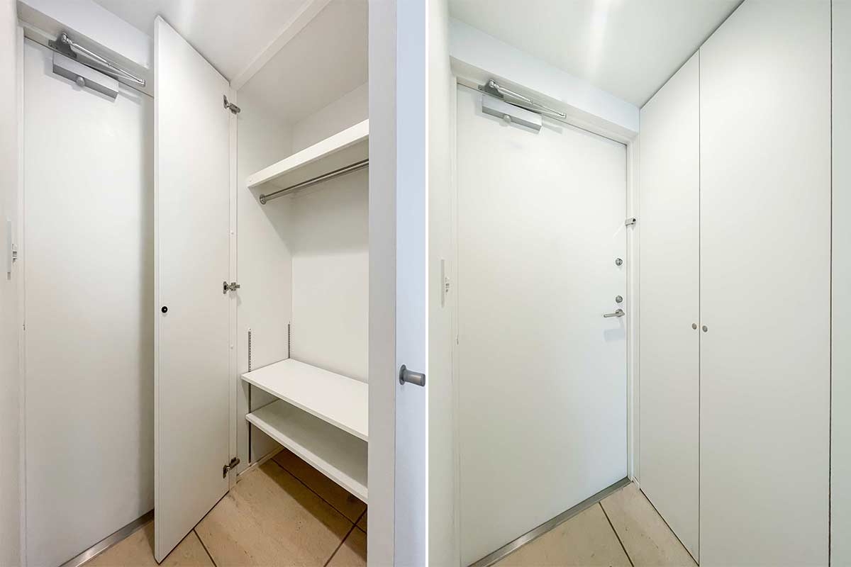 収納は玄関の壁一面にクローゼットと靴箱が並んでいます。