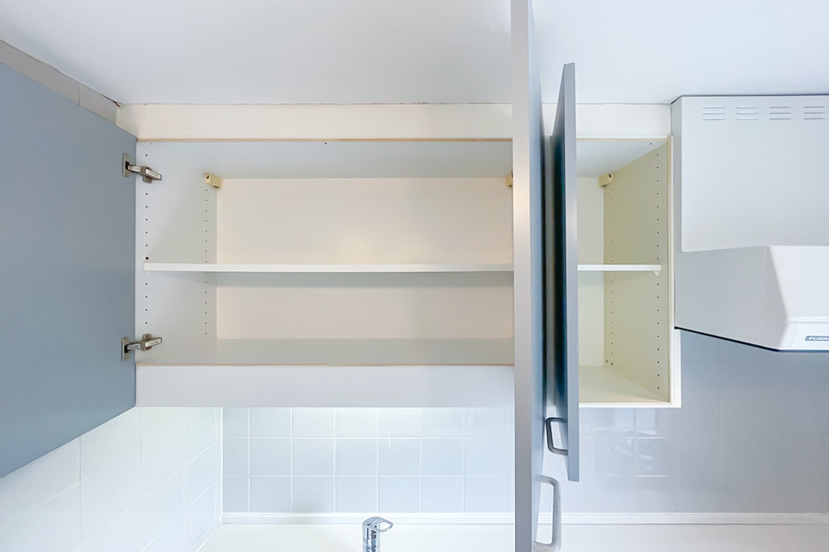 キッチンは洗濯機置き場を含めて6帖の広さ。淡い水色の爽やかなキッチンで、3口コンロ、収納も十分◎バルコニーに通じる扉もあります。