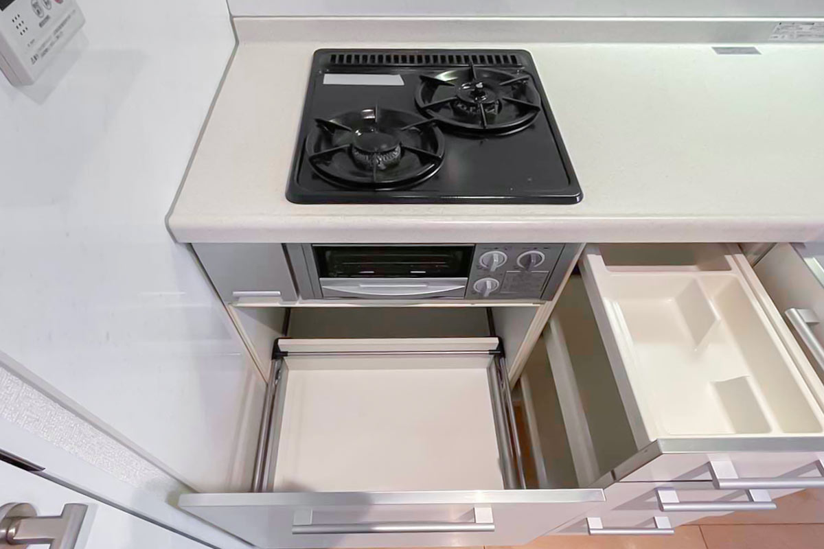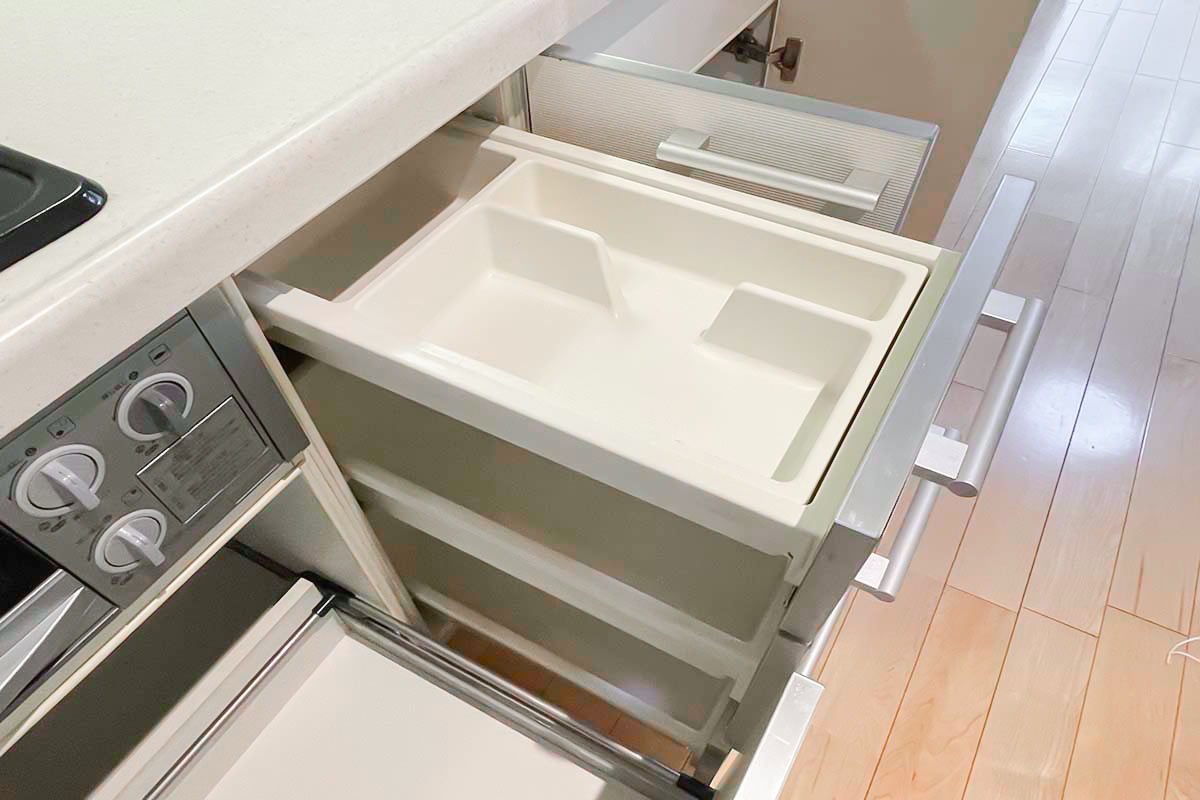 大きなフライパン・鍋も収納できそうでした。洗い物が少なくなる工夫をして調理を楽しみましょう!