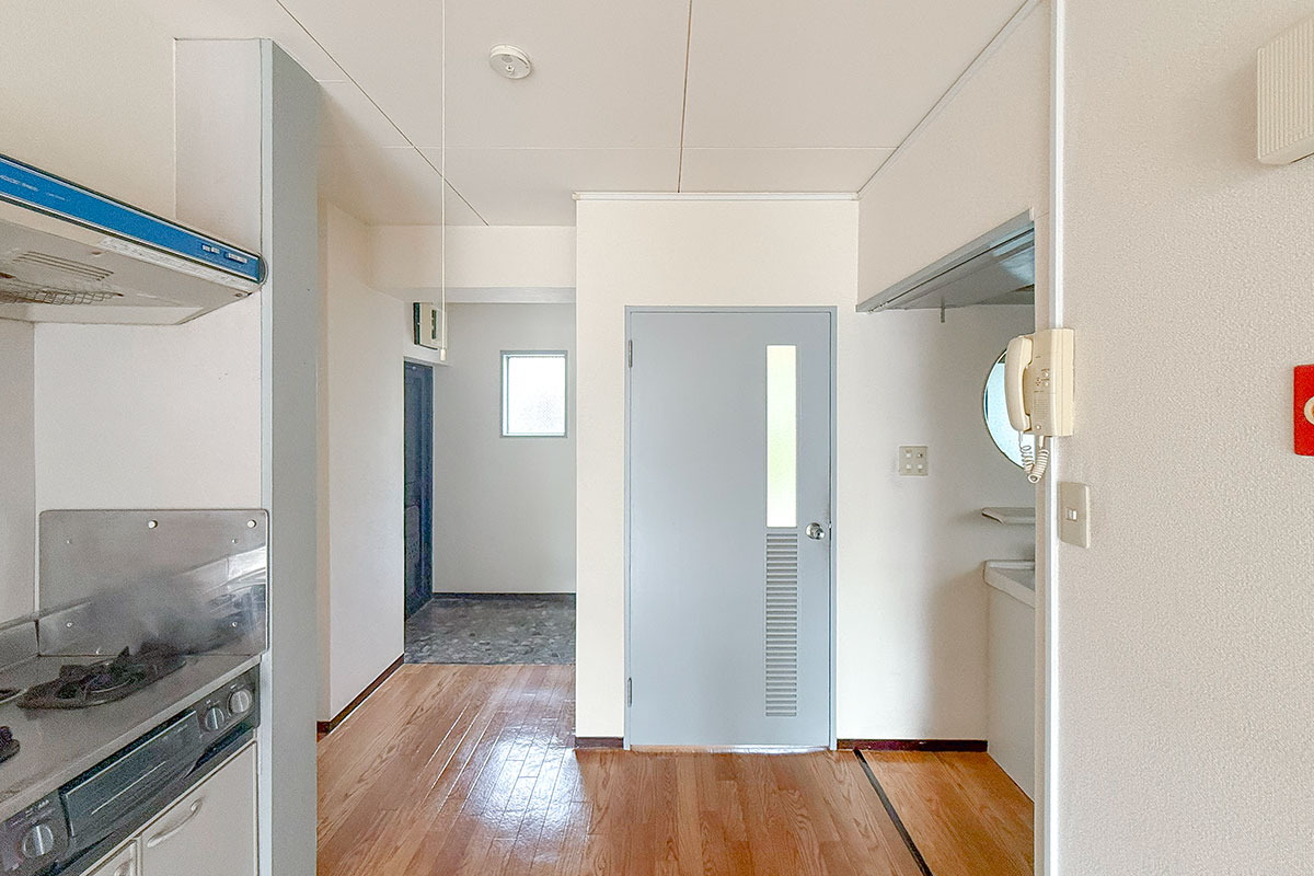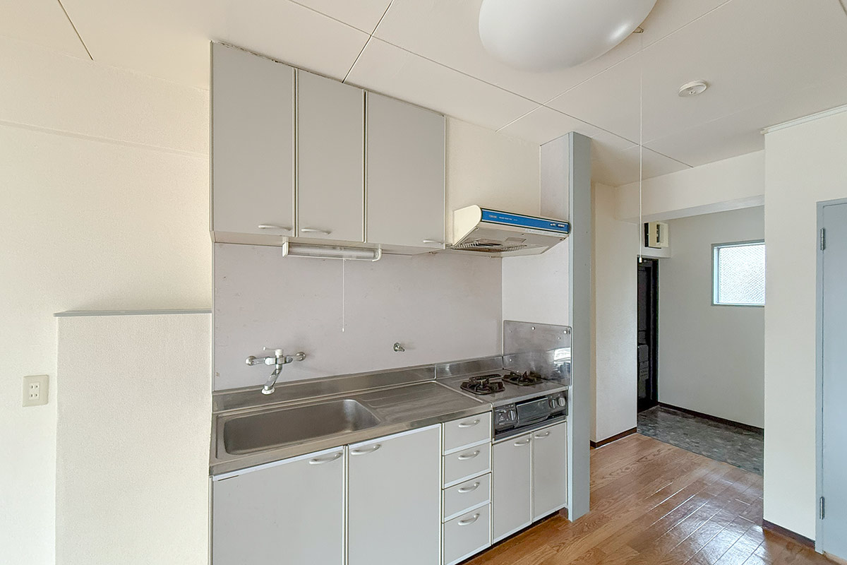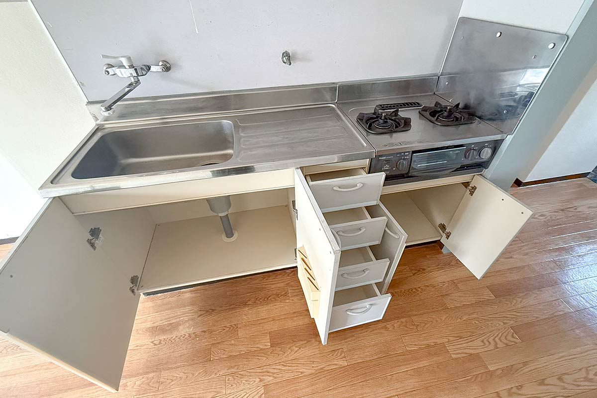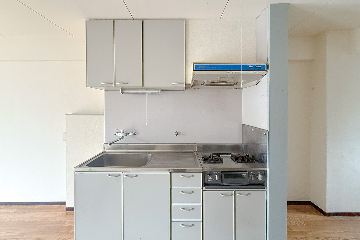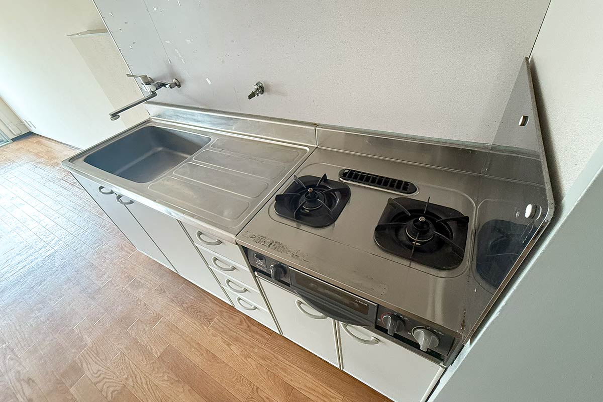 室内は最新設備が整っているわけではないけど、キッチンはグリル付き2口コンロが設置済。