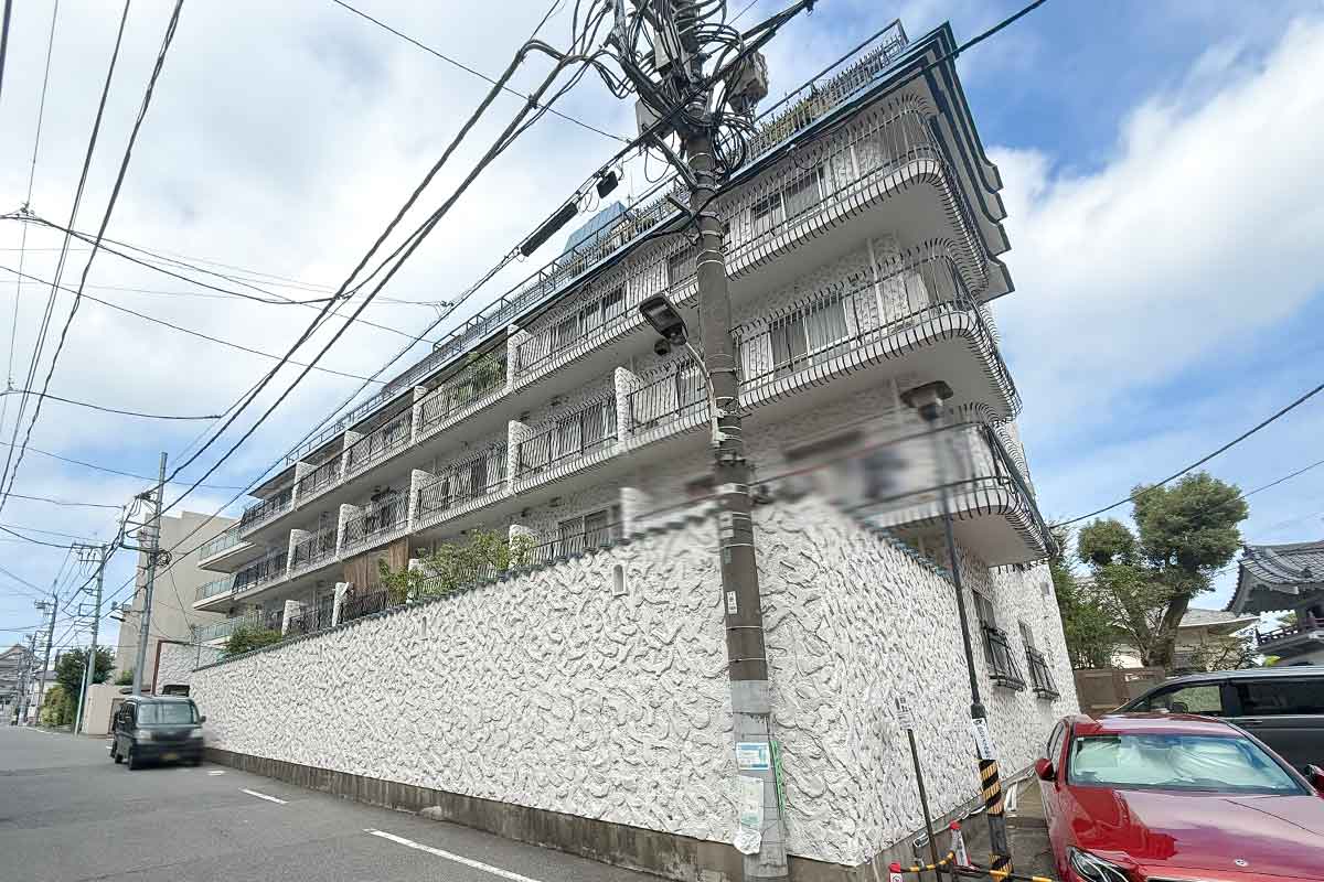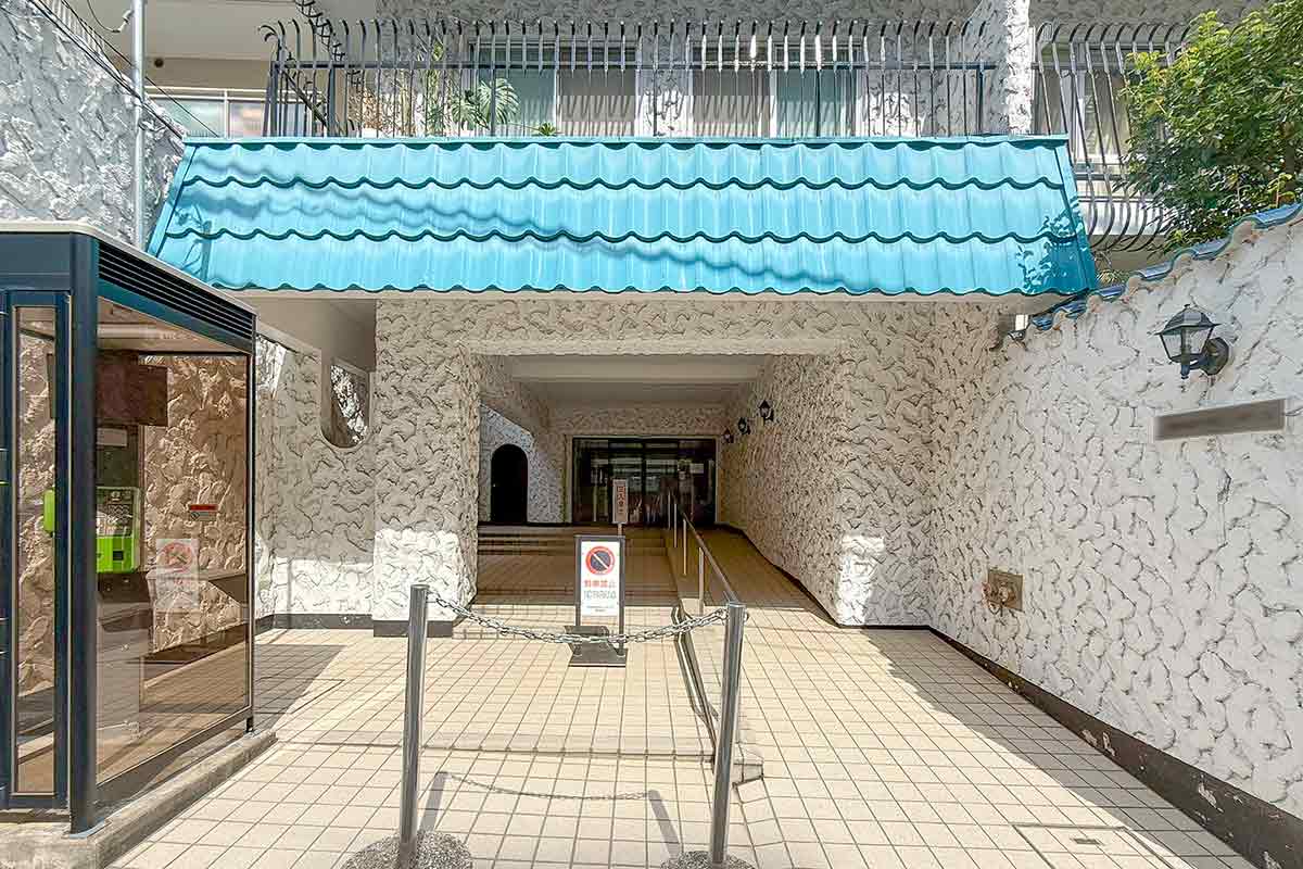 青い瓦屋根に白いスタッコ壁の塗り壁、アイアンフレームがシンボルの秀和レジデンス。