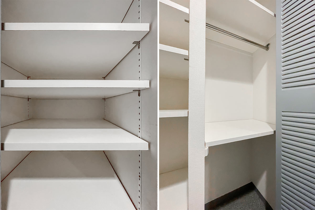 ハンガーパイプは付いていないのですが、もはや個室のような広さがあり、ハンガーラックの数やケースの数を自在に調整して自分に合った収納の量・種類にできます。