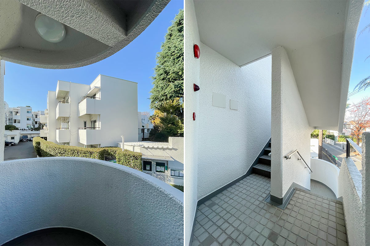 建物は直方体が斜めに雁行してつながり、1つの棟を形成。計4棟が並びます。どれも3階建てのどっしりと構えた低層住宅で、各部屋までは階段室タイプで独立性が高い造りです。