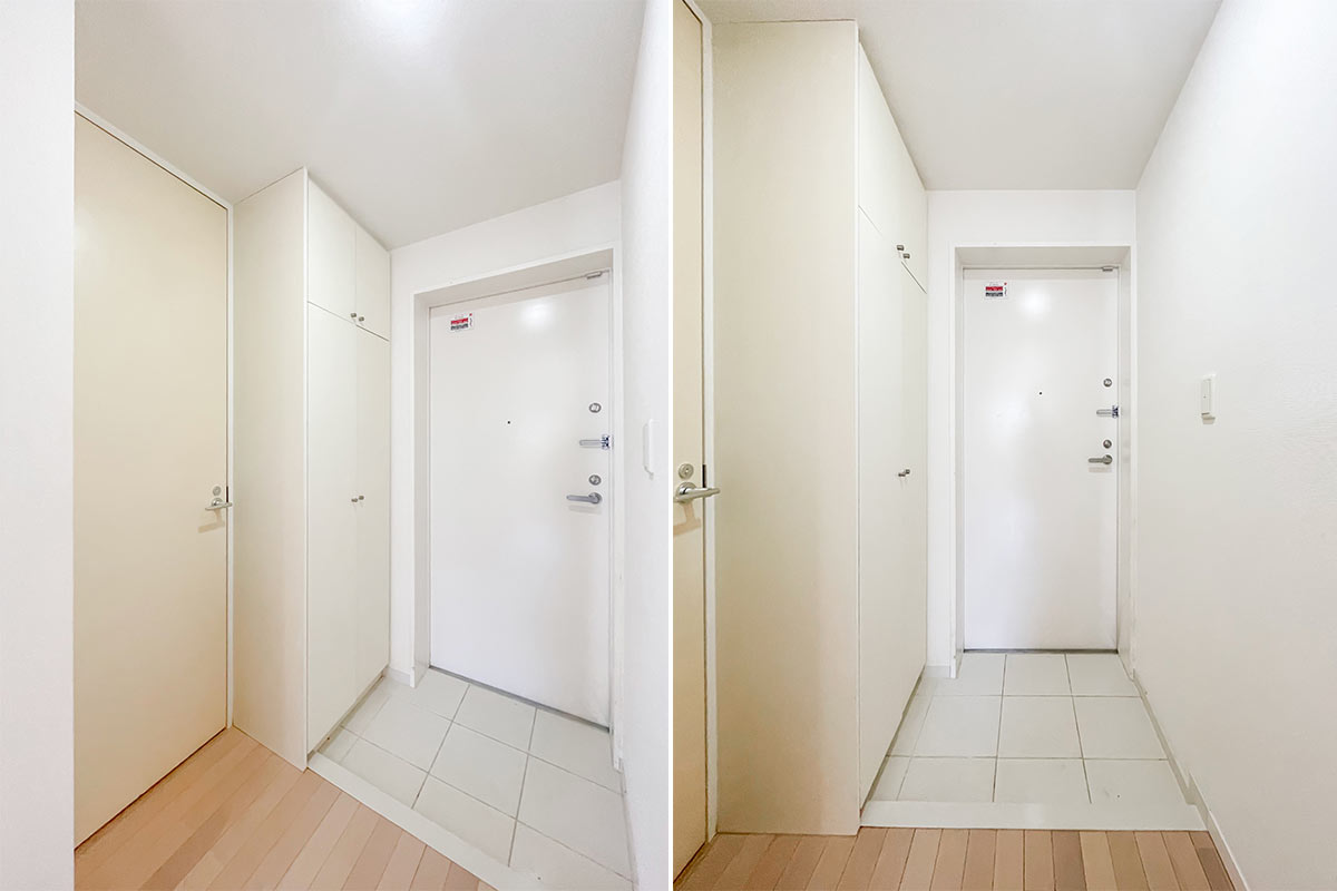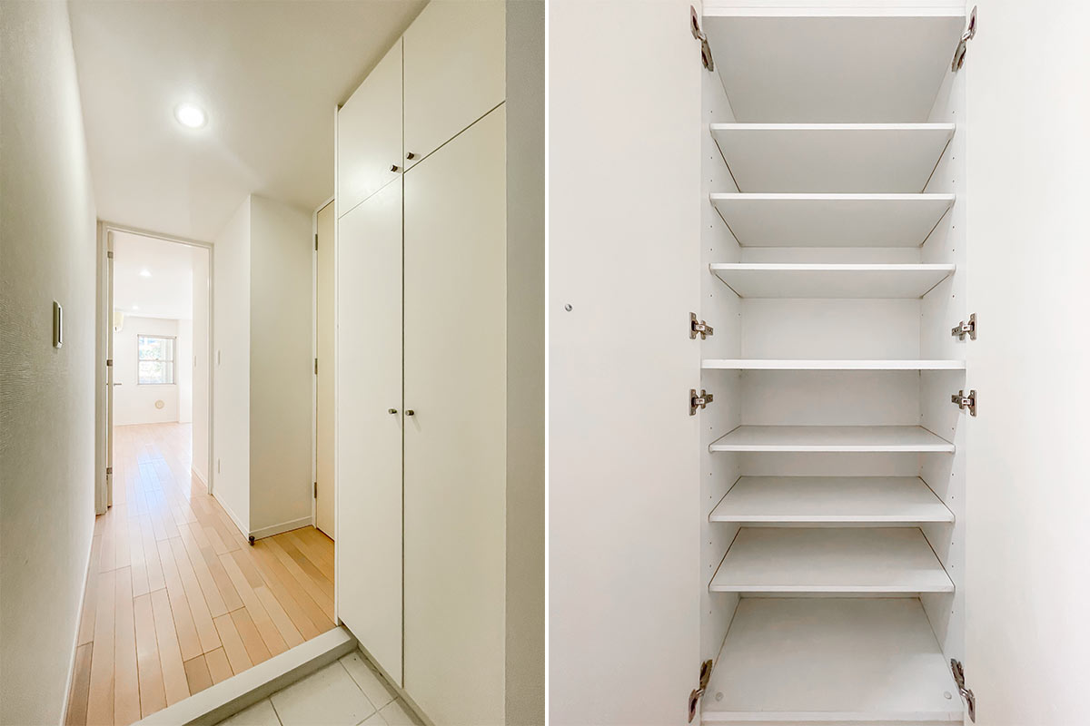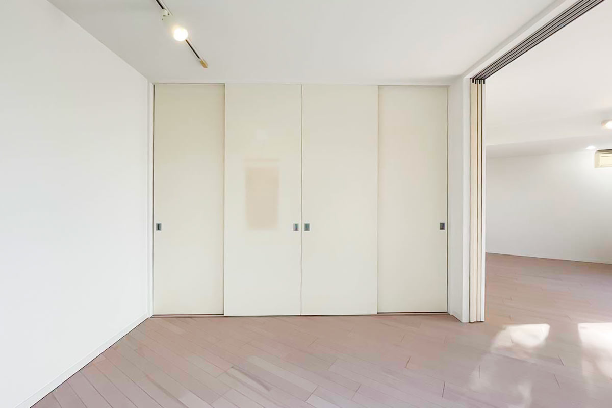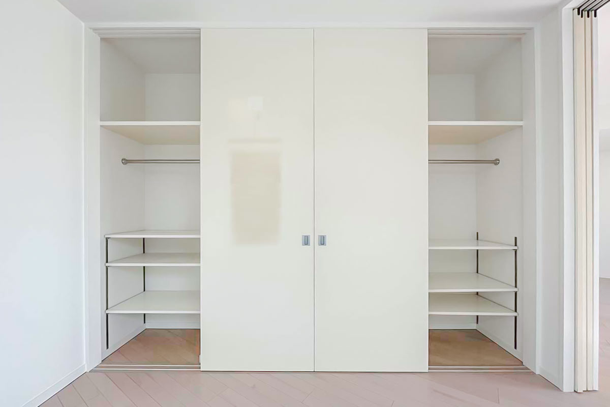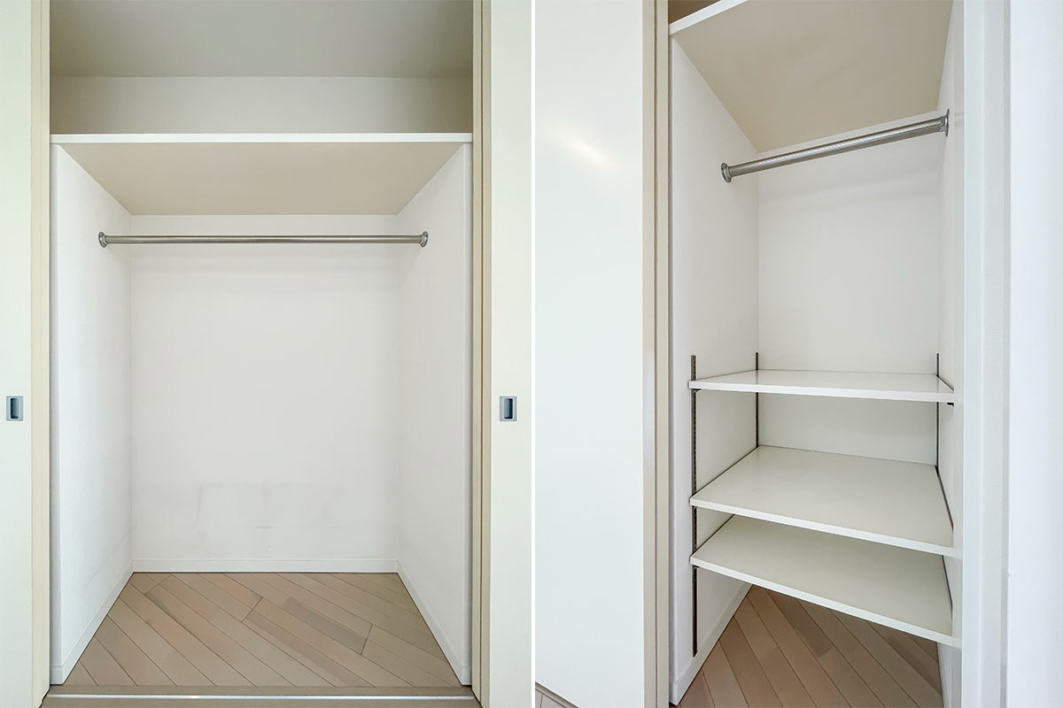 収納は洋室エリアに壁一面たっぷりと。全て洋服を掛けるクローゼットにしてもいいし、棚を活用して本や小物収納にも使えて、住む人に合わせてくれる優しさがあります。