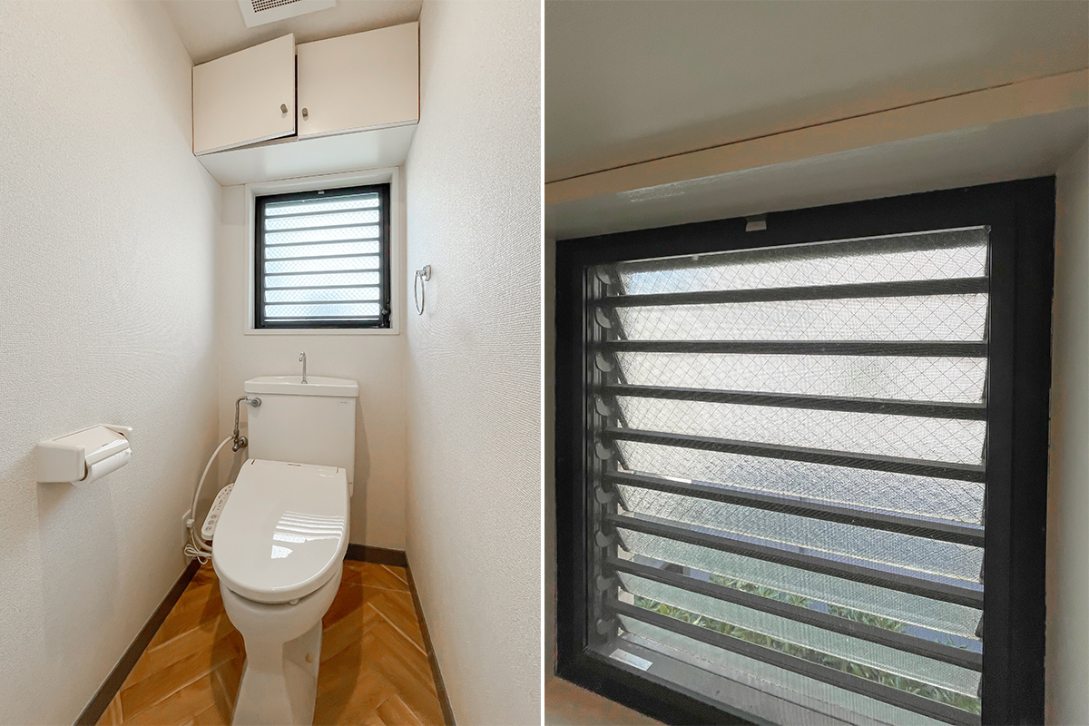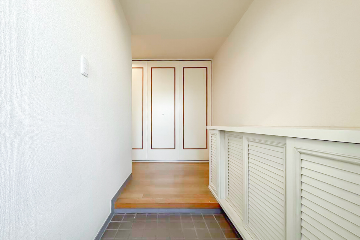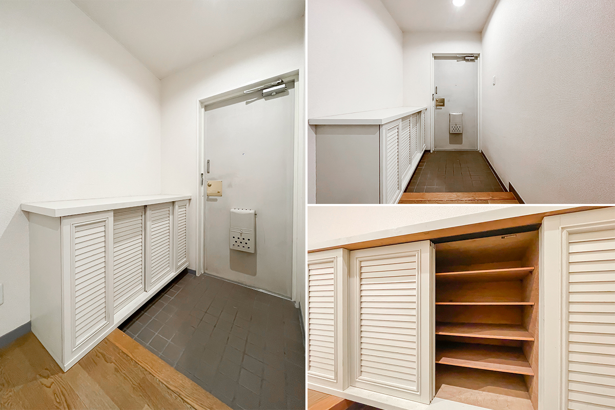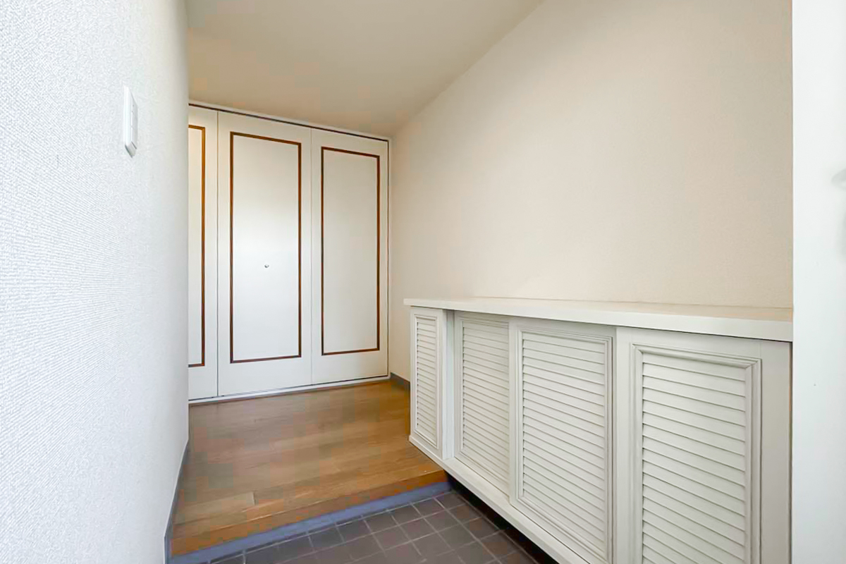 小さな玄関ポーチがあったり、ルーバーデザインの靴箱、建具や出窓のレトロさも素敵。
