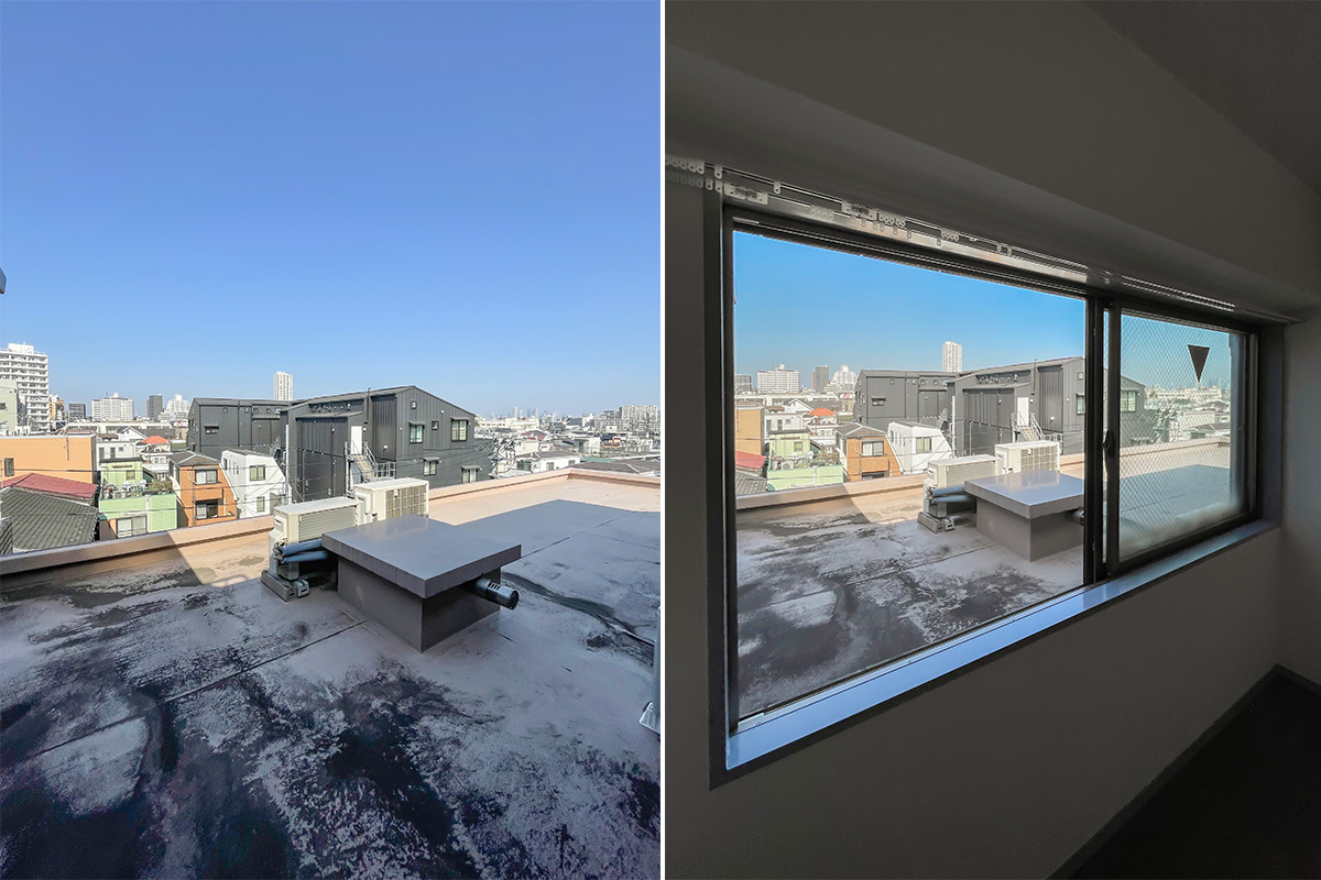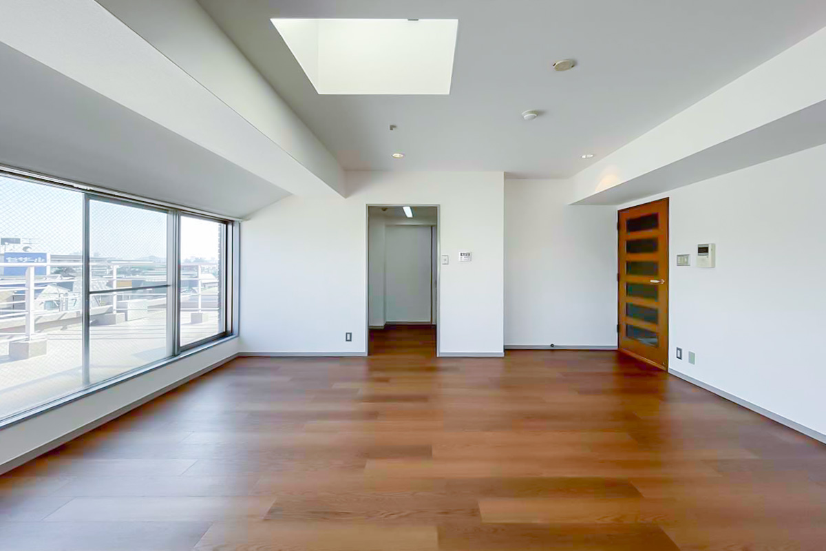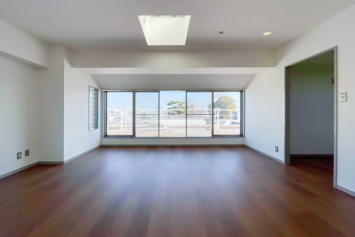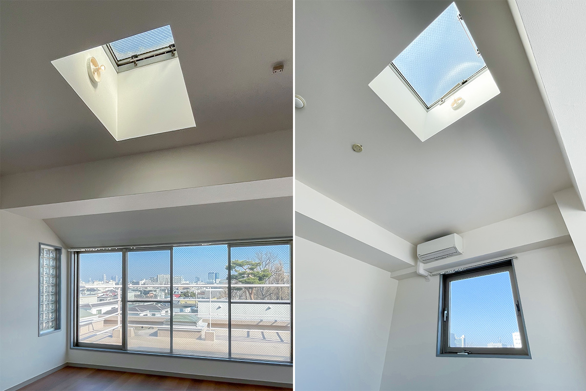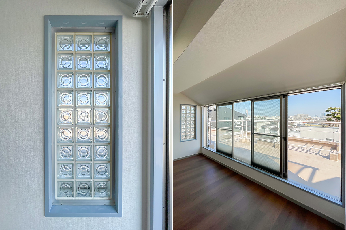 ただ眼前に広がる広いルーフバルコニー、ワイドな窓、2面採光、さらには天窓まであって、部分的にガラスブロックも。シンプルなのにどこか個性的な・開放的な空間になっています。