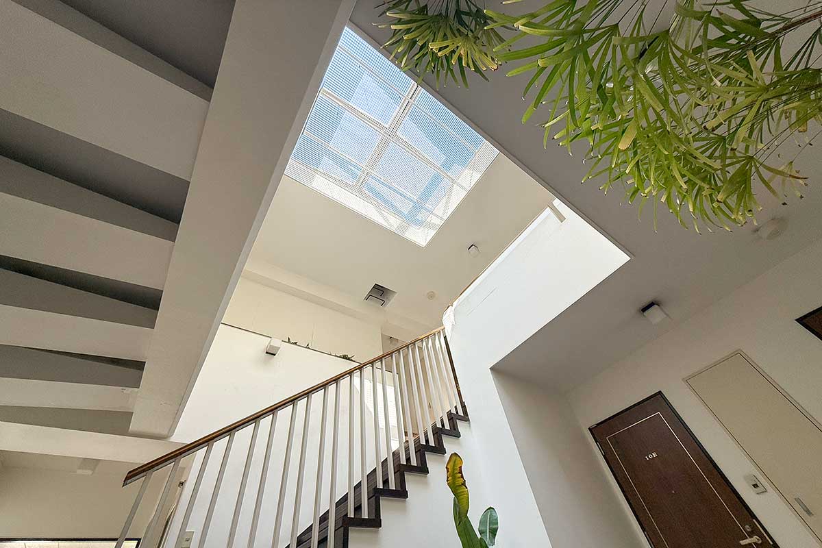 オートロックの先にはコの字型に住戸が囲う内廊下の共用部。