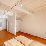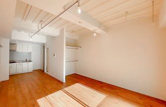 お部屋は、約46平米の1LDK。縦長タイプのお部屋は、約12帖のリビングダイニングキッチンと約7.5帖の洋室で、シンプルな間取りです。
