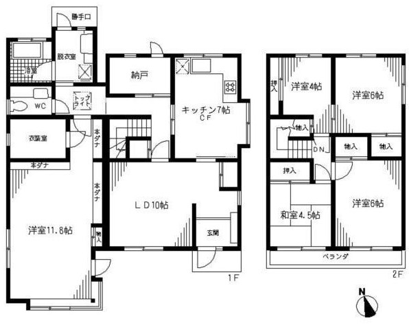 2階は4帖の洋室と6帖の洋室が2つ、4.5帖の和室の4間。