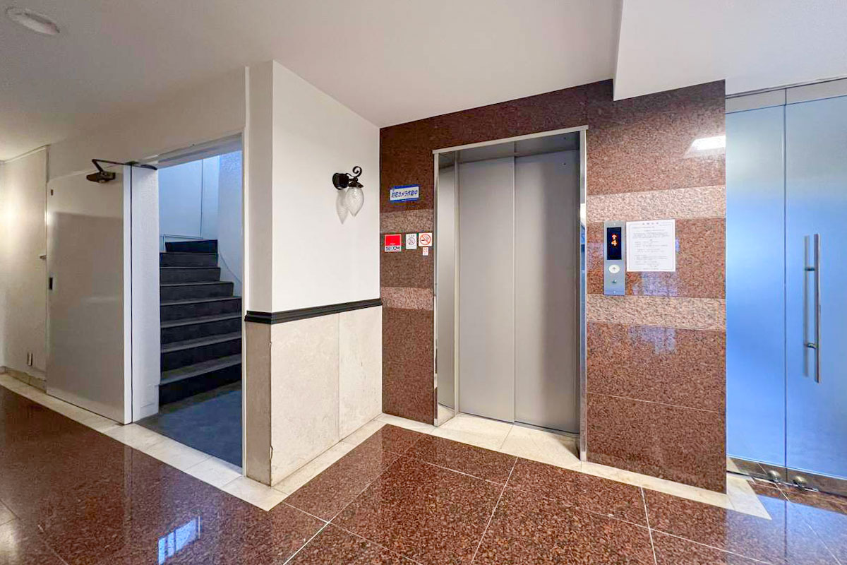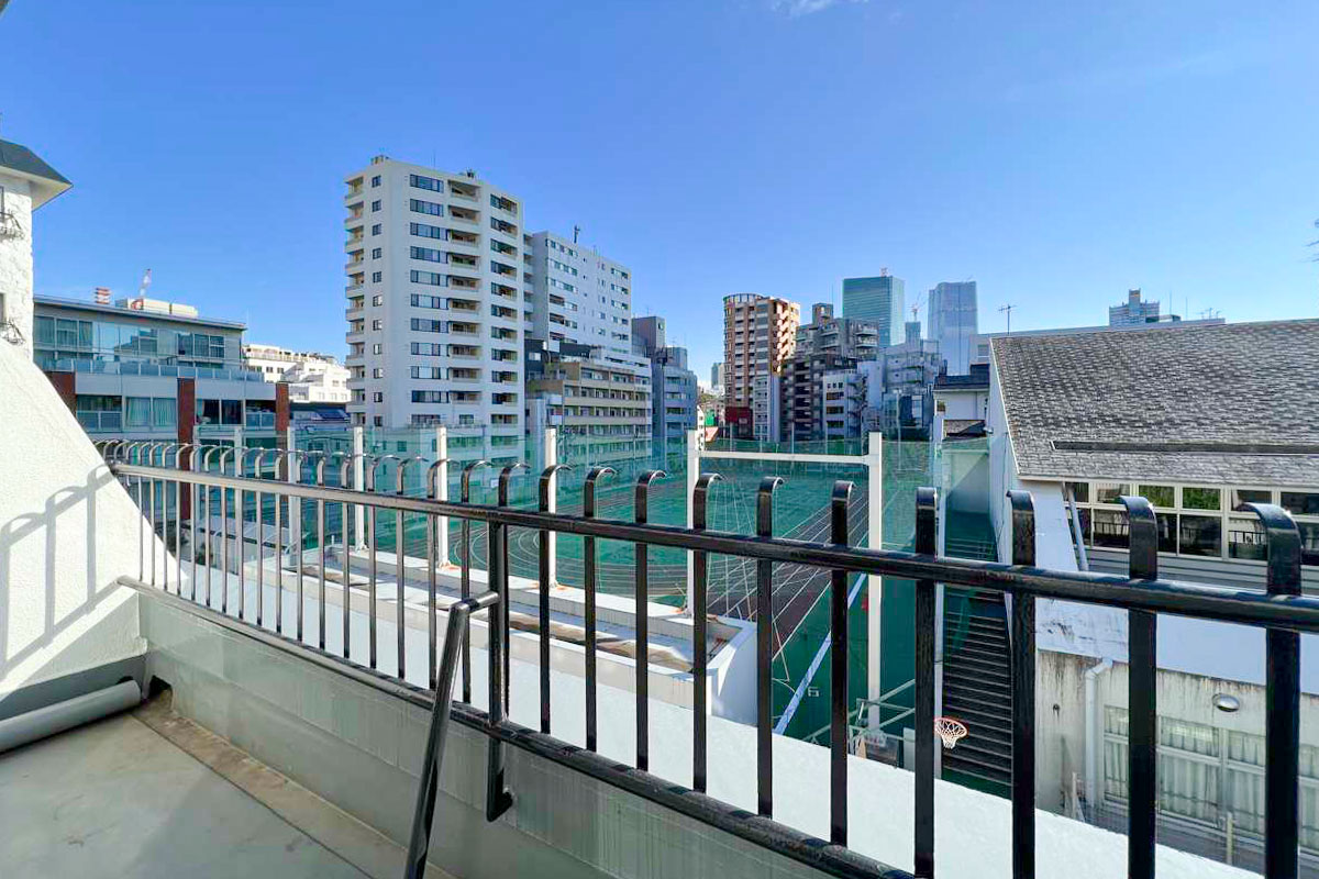 青色の瓦屋根でおなじみの秀和シリーズの物件、エントランス付近には管理人さんがいるので安心。すぐ隣には赤坂小学校があります。昼間は児童たちの賑やかな声が、かすかながら聞こえてきました。