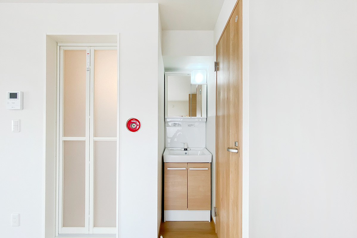 一面のみブルーグレーの壁紙が施されアクセントになっています。