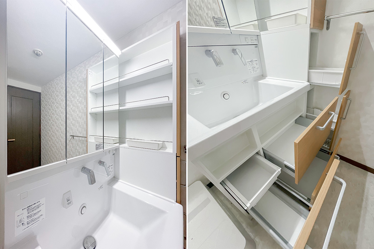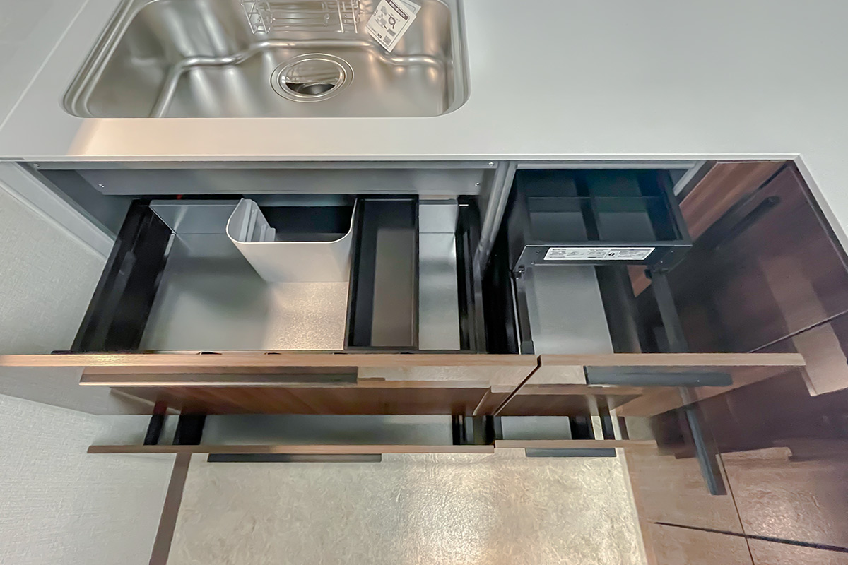 作業スペースの広さは言わずもがな、収納が大大大容量!そしてシンク前には使いやすい目線の高さまで降ろせる収納棚も。