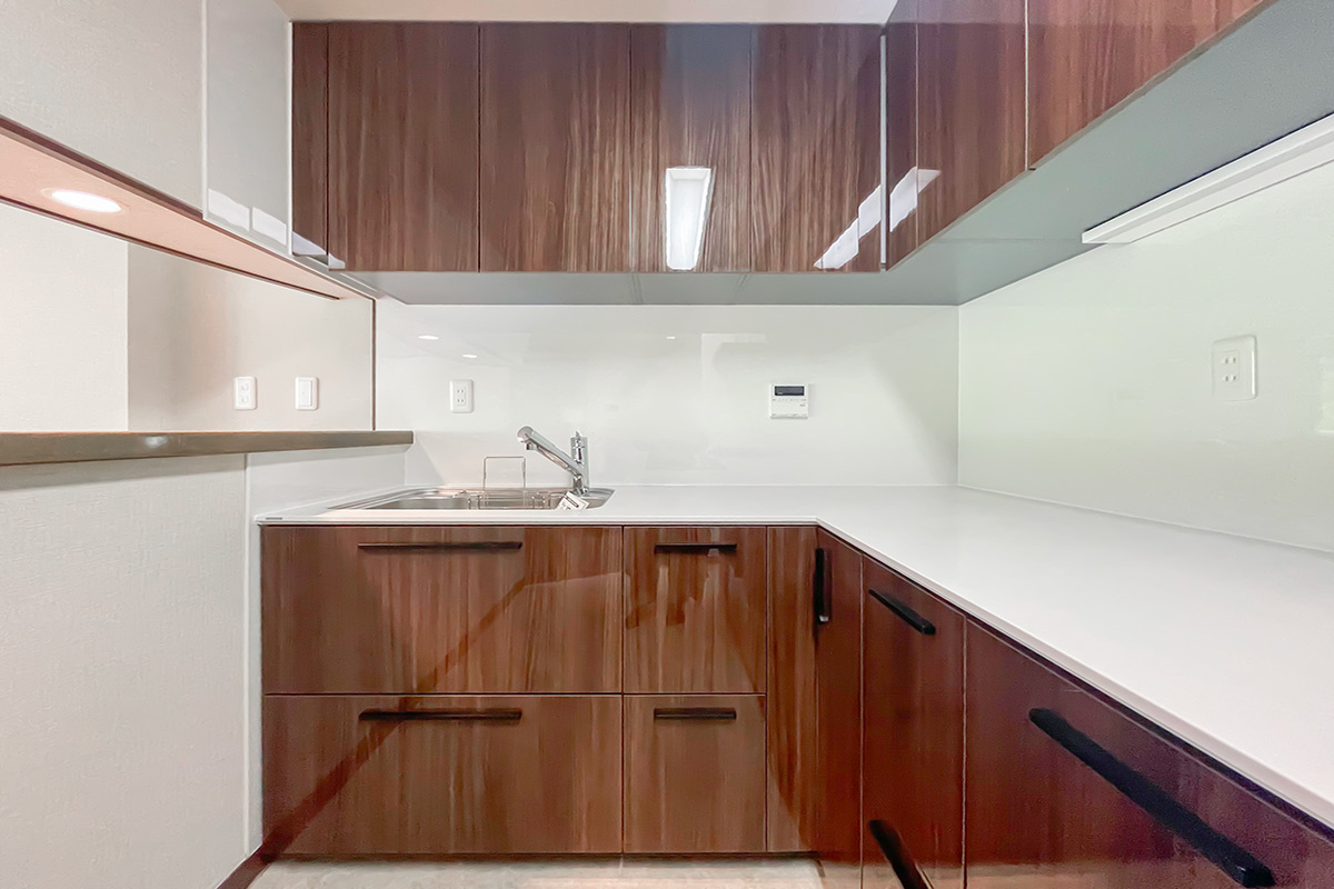 キッチンは大きなL字型。新規入替でとても綺麗で機能充実です。