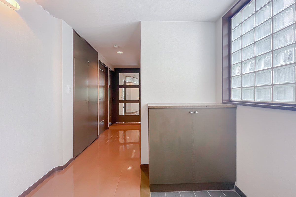 玄関にもガラスブロックの壁があり、光を取り込んでくれる明るい玄関です。
