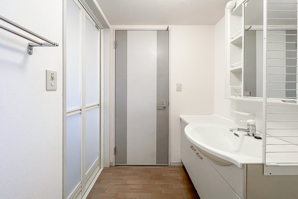 洗面脱衣所の手前の廊下にもちょっとした収納スペース。ストック用品がここにあれば、詰め替えの家事もスムーズですね!