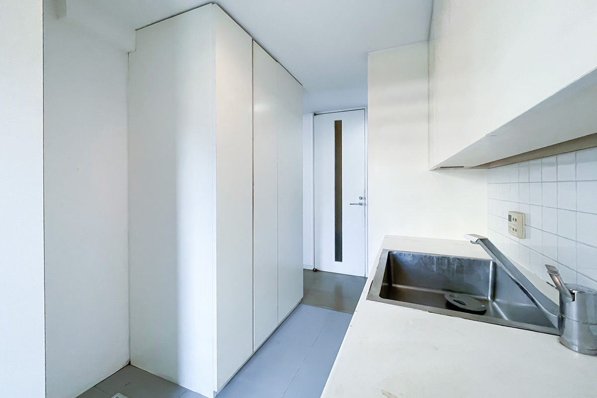 3口コンロとグリル付きで、作業スペースも十分。キッチンの上下収納に加えて、LDからキッチンへの通路にも大きな扉付きの収納付き。パントリーのように使えることでしょう。