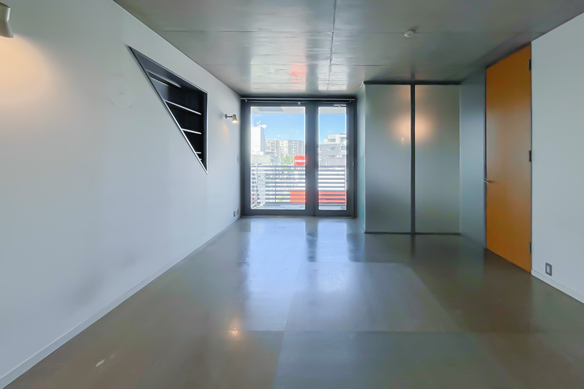 部屋全体にモルタル風の床材が用いられ、特徴的な三角形の形をした壁内シェルフ付き。
