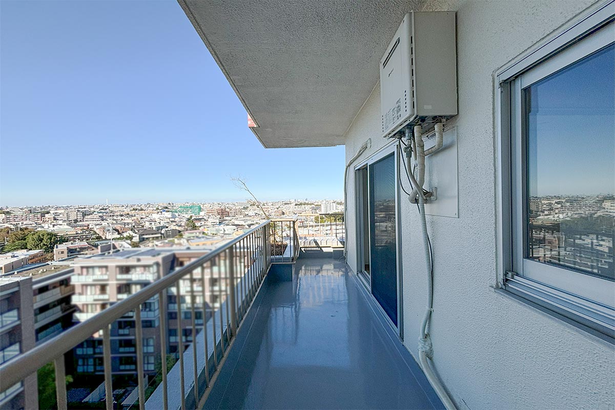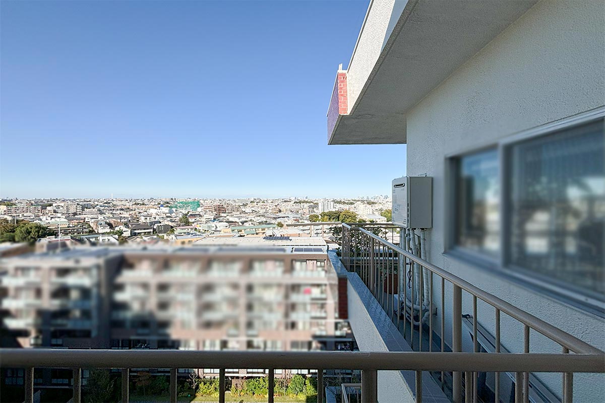 バルコニーは洋室をL字型に囲むように配置されていて、西側は2面採光の明るい空間。