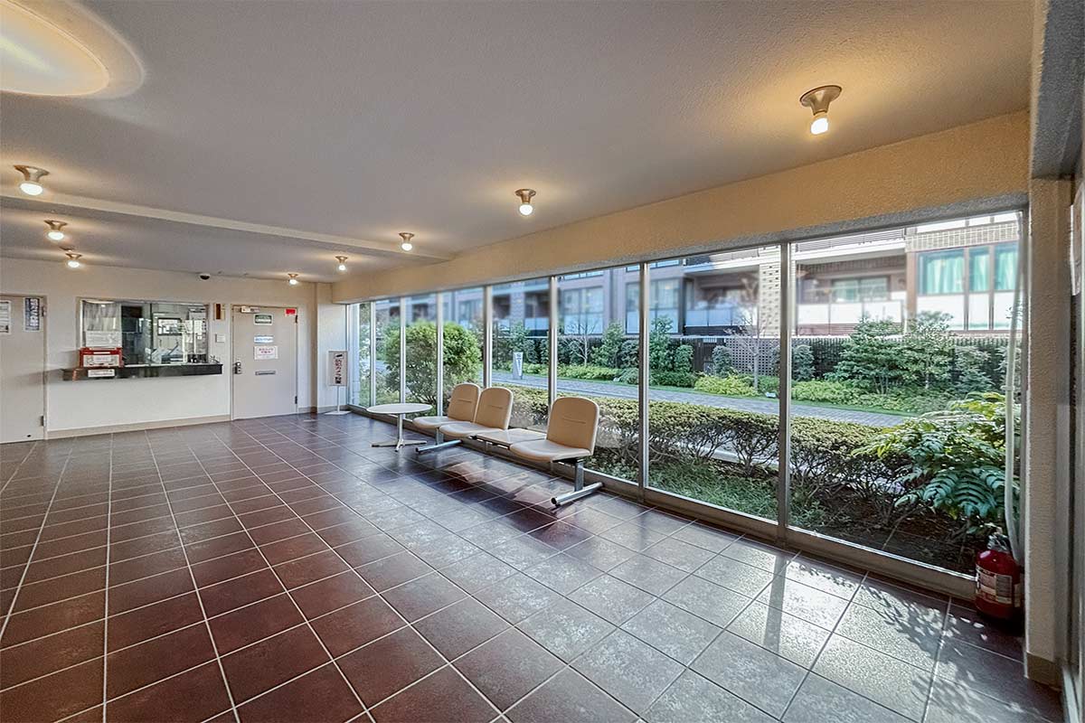広々としたロビーの横の管理人室を通り抜けて、エレベーターホールのある奥の棟へ向かいます。