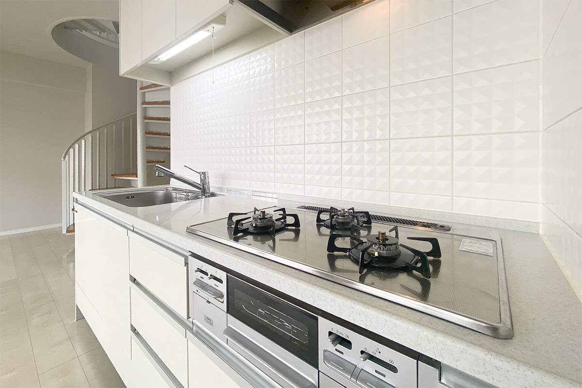 立体的なタイル壁のキッチンにはグリル付きの3口ガスコンロ。