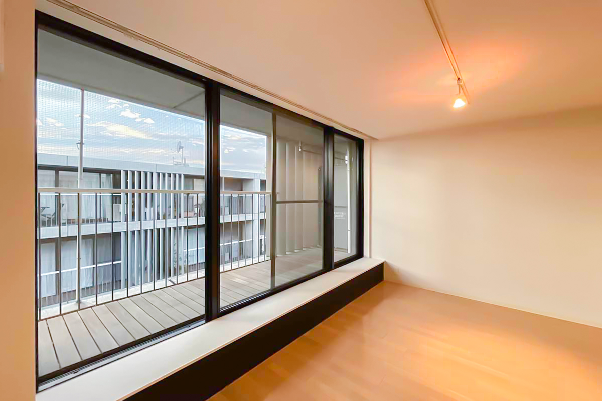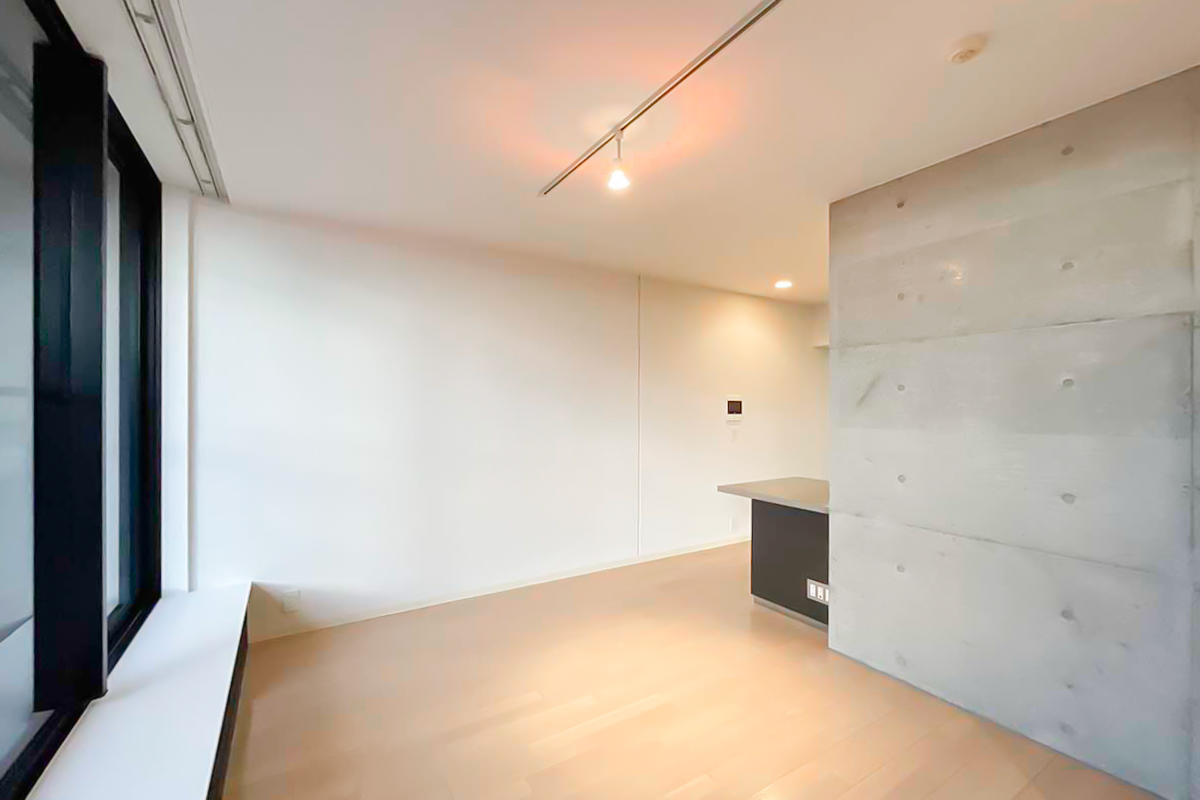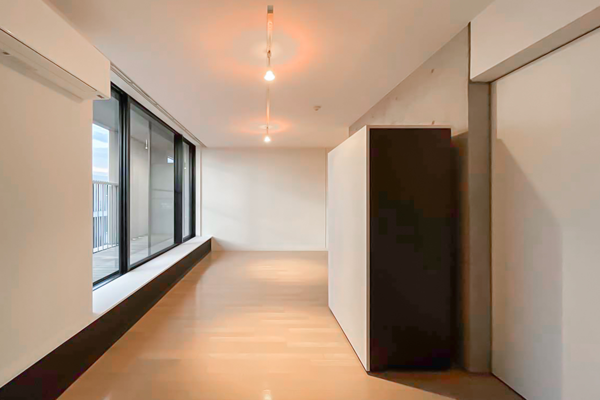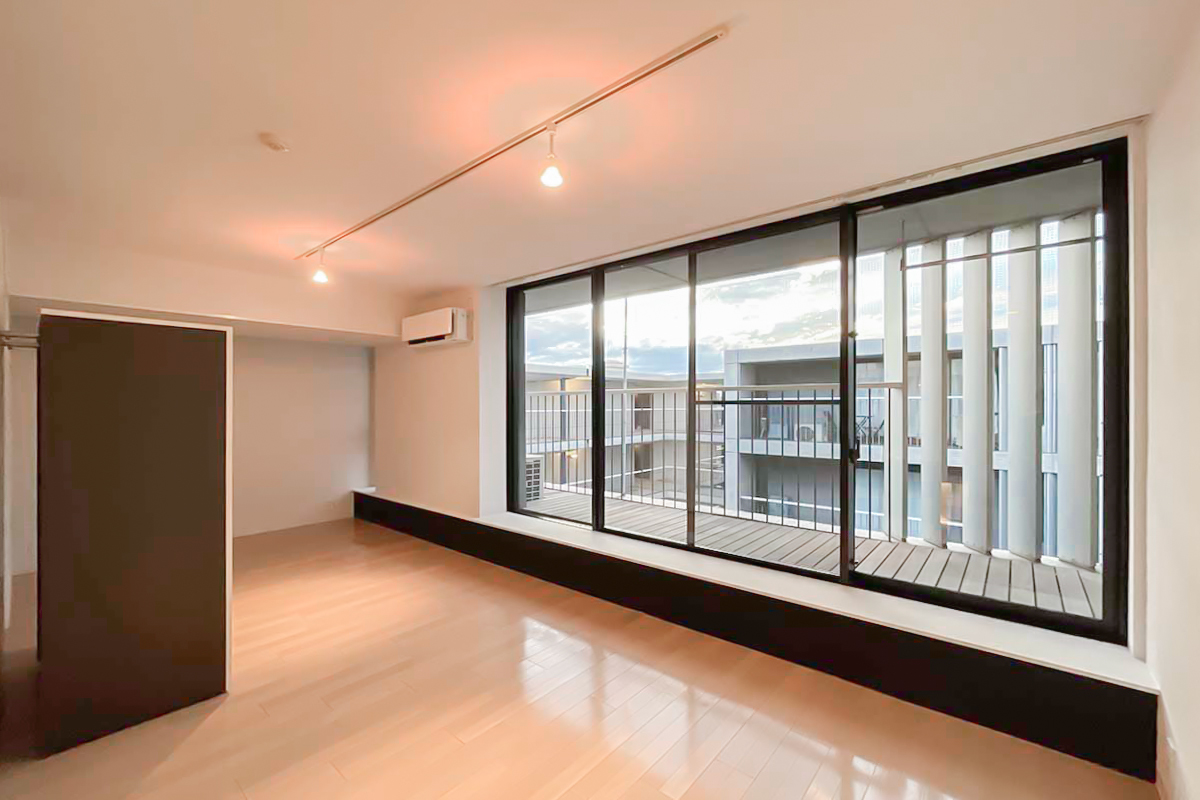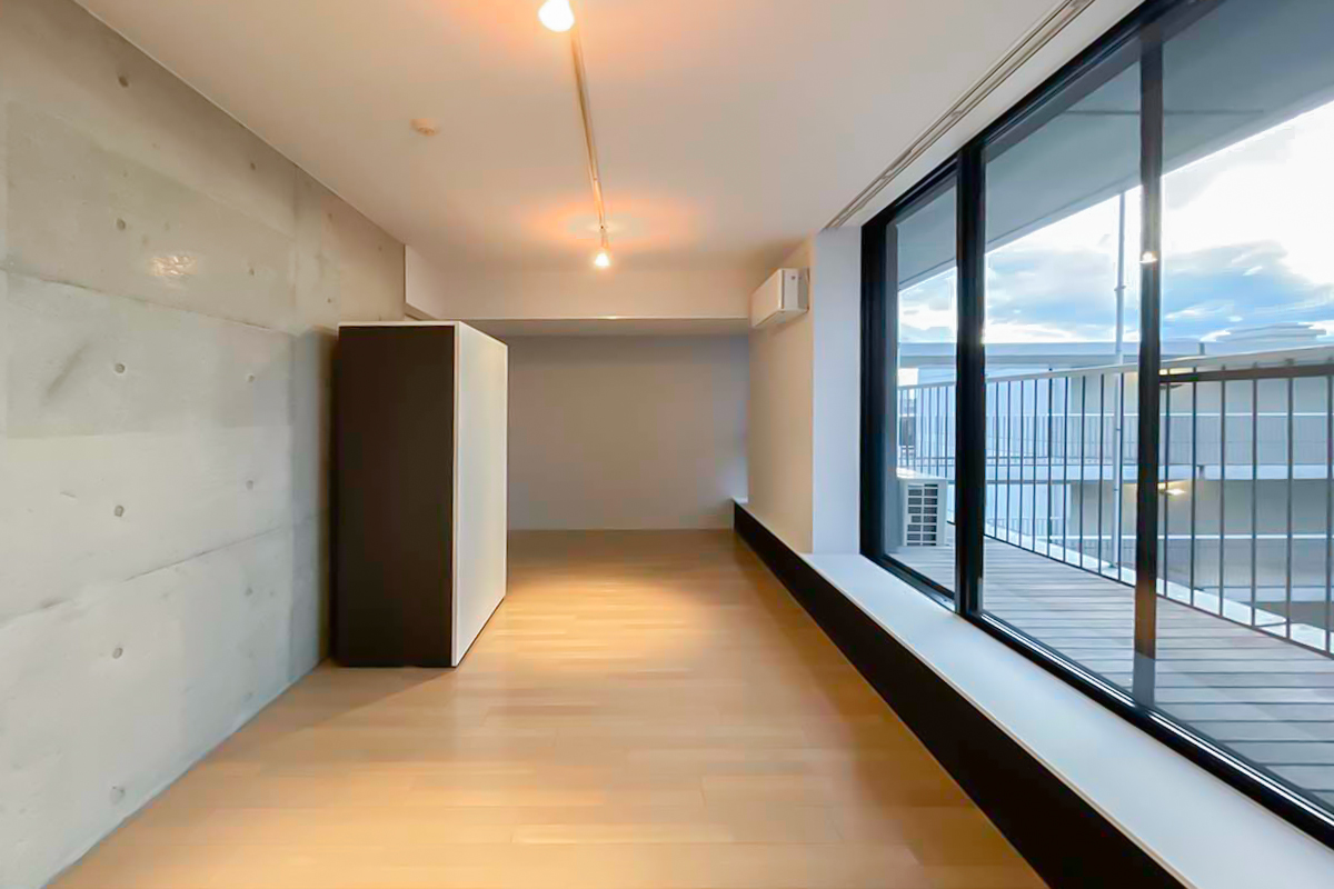 室内は約34㎡の1R。部屋に入ると、天井まである大きく幅広の窓が気持ち良く光を取り込みます。