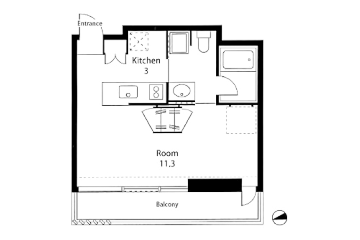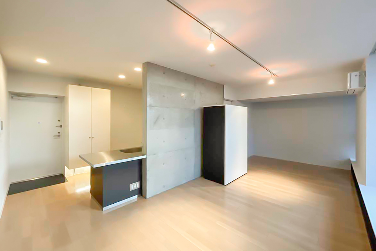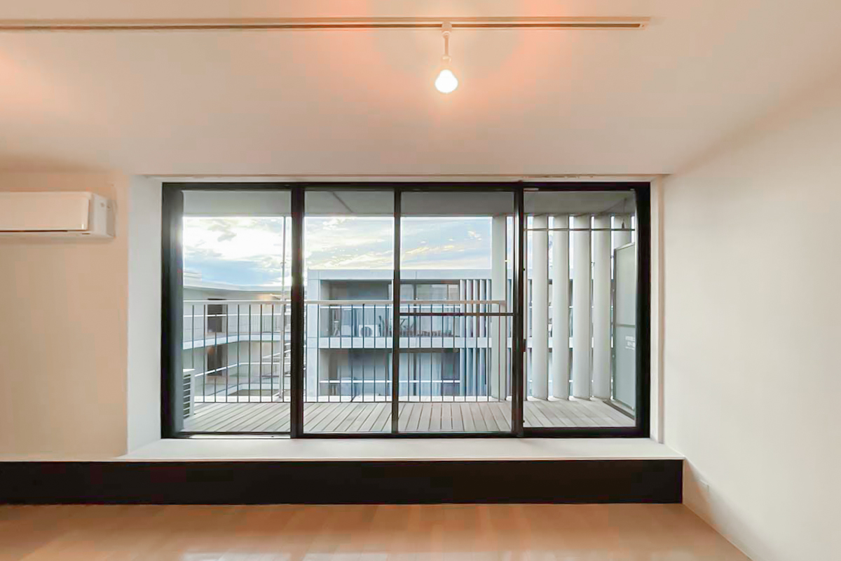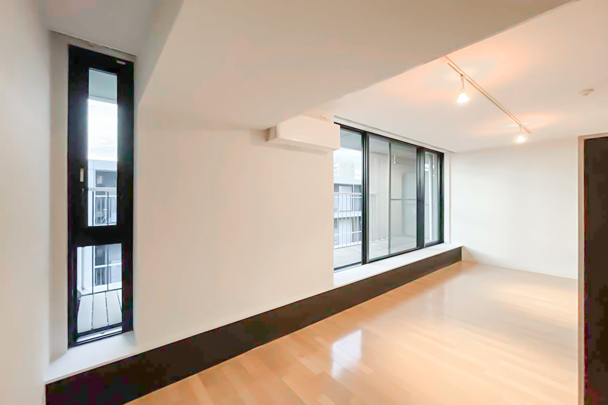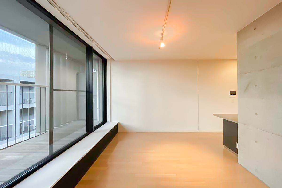 室内は約34㎡の1R。部屋に入ると、天井まである大きく幅広の窓が気持ち良く光を取り込みます。