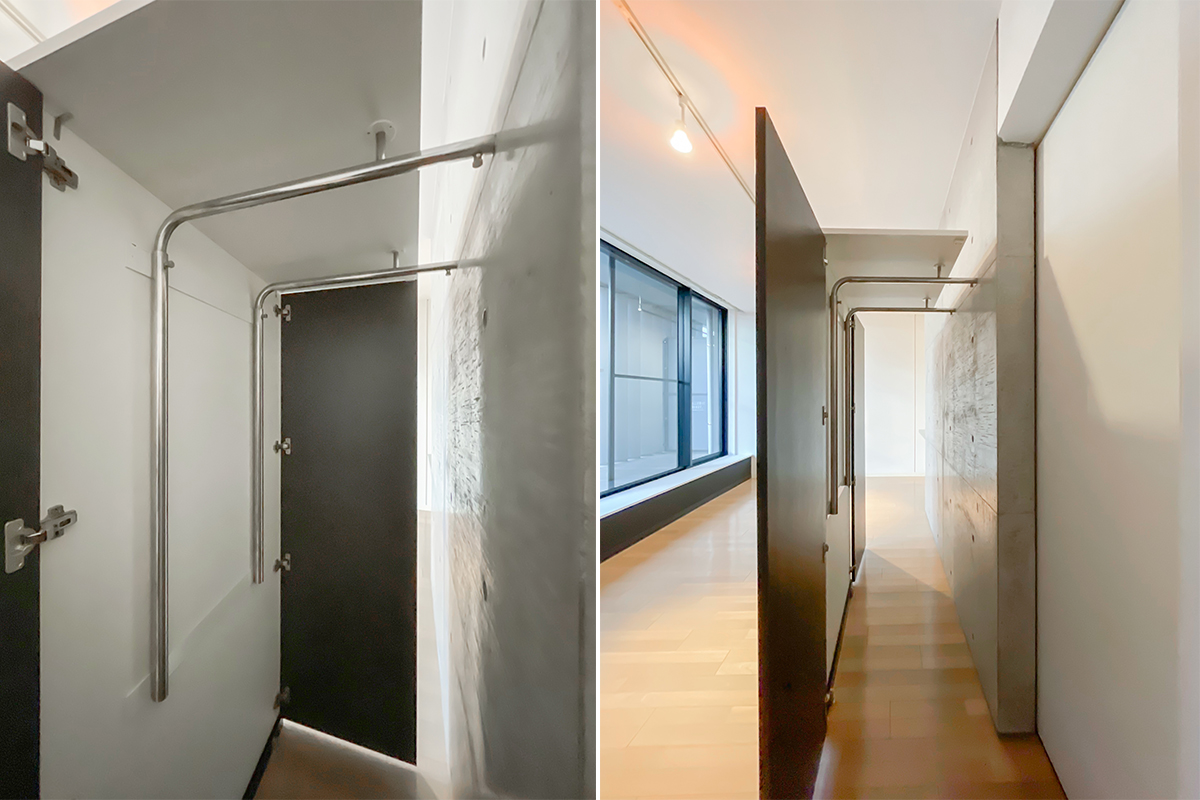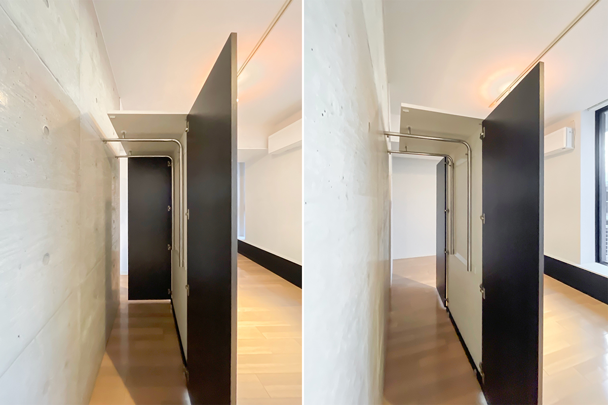 左右両方端に扉があり、開くと中に衣類かけることが出来る工夫がされていました。