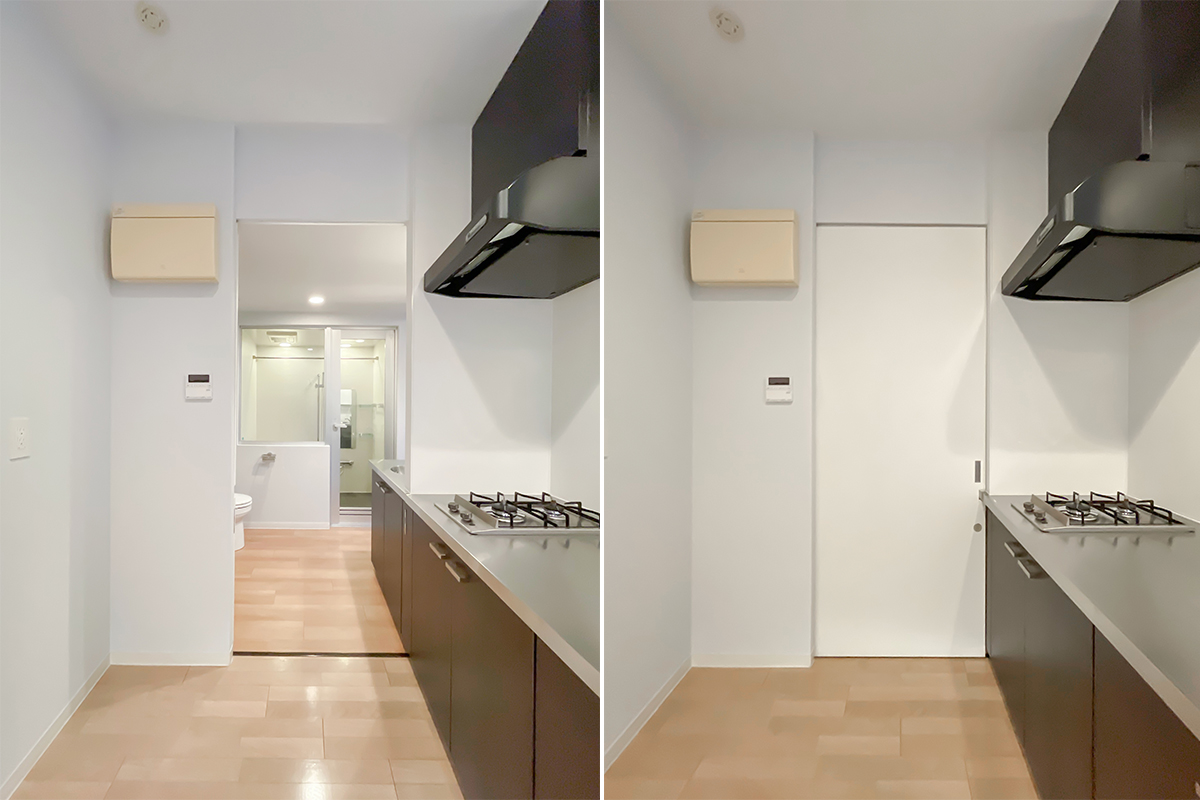 必要最低限の設備と空間の中で、豊かな生活を送ることができるよう設計されたというこの部屋は、スライド式の扉を開くと、全ての空間がひと繋がりになります。